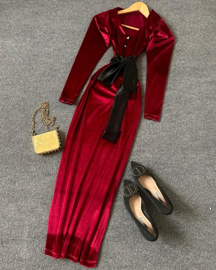 پیراهن مخمل یقه دلبری کمربند پاپیون ساتن کد 1615