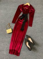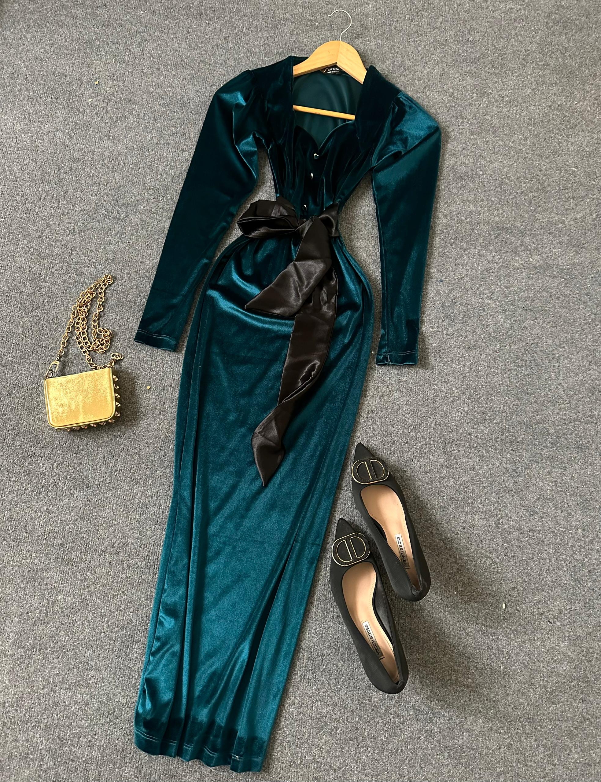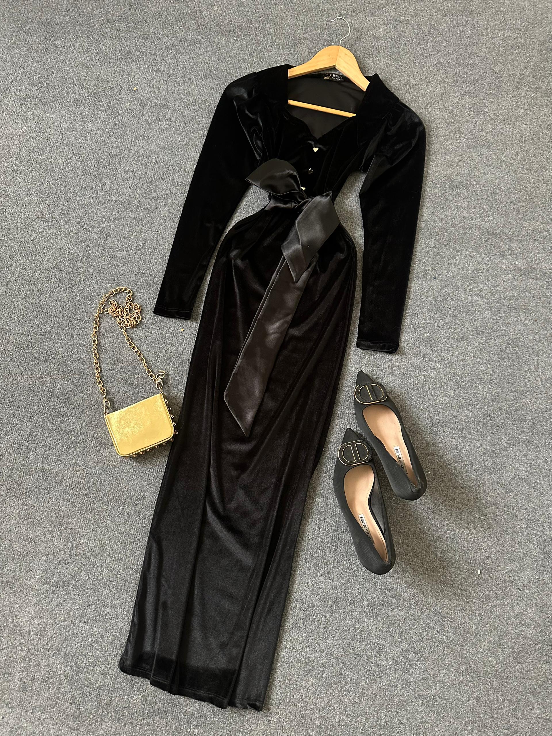 پیراهن مخمل یقه دلبری کمربند پاپیون ساتن کد 1615